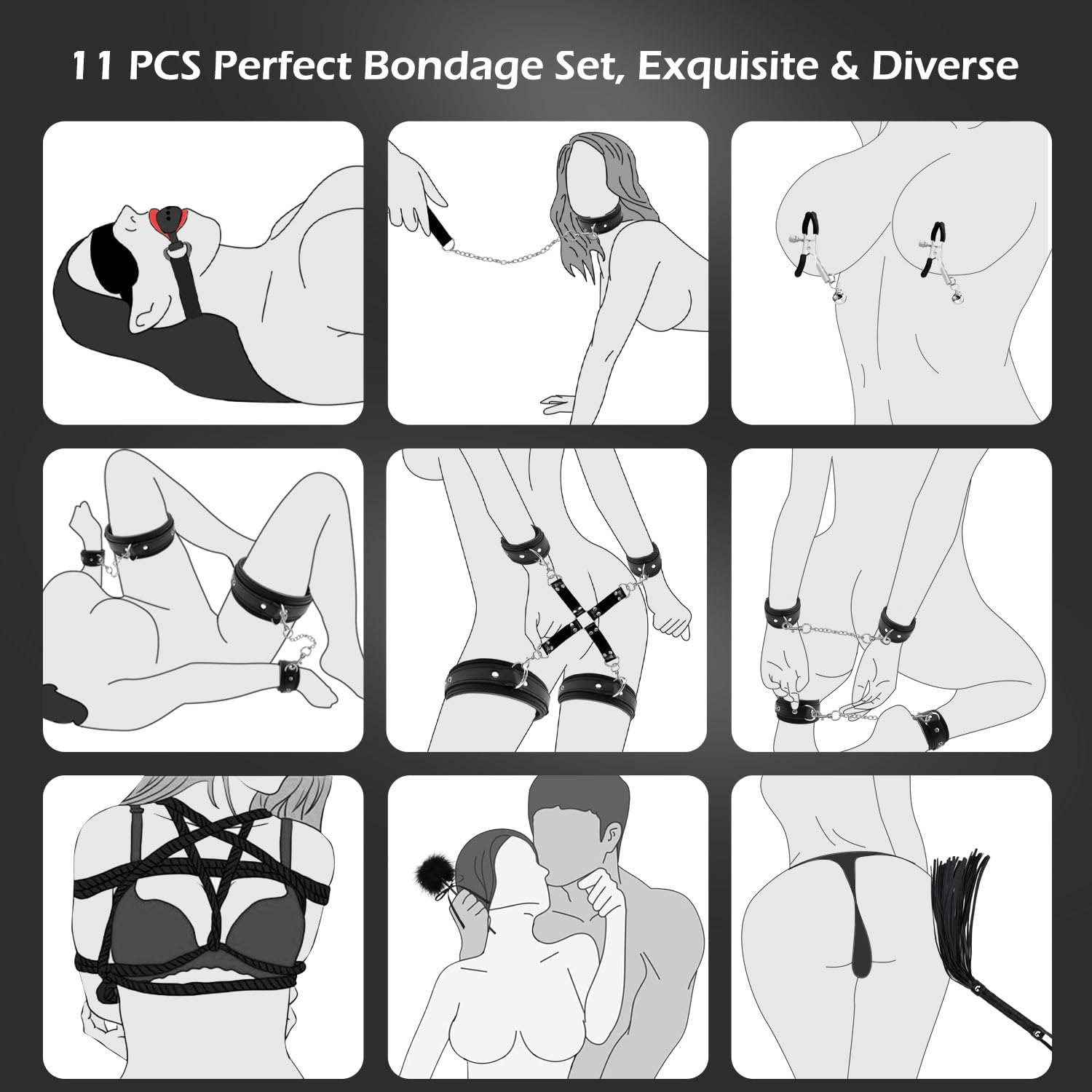- [ Bring All Your Kinky Fantasies to Life with 11 Pcs Bondage Set ! ] - This bondage kit includes 11 different items: ( 2 thigh cuffs, 2 handcuffs, 2 ankle cuffs, a cross strap, a ball gag, a bondage collar, a feather teaser, a blindfold, a sex rope, a leather flogger, and a pair of nipple clamps ). Whether you are a total beginner or an experienced dom/sub, this set has everything you need to explore all aspects of BDSM.